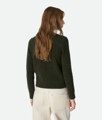 Jumper in wool boucle with metal knot button detailing at the shoulder. Product Details - Wool boucle jumper - Metal knot buttons at the shoulder - Regular fit - Color: Dark Green - Made in: Italy - Product code: 811503V4WQ03350 Material - Material: 100% Wool Size & Fit - Model is 179 cm | 5'10" and is wearing a Bottega Veneta size S