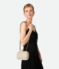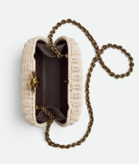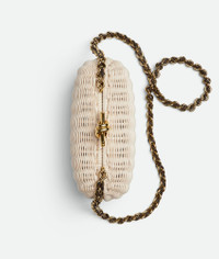 Minaudiere clutch in wicker with signature knot closure and cross-body tubular leather Product Details - Wicker minaudiere with cross-body leather braided metal chain - Single compartment - Metallic knot clasp closure - Material: rattan, lambskin - Lining: Lambskin - Color: Natural-Fondant - Hardware: Brass finish - Height: 11 cm | 4.3” - Width: 19 cm | 5.1” - Depth: 5 cm | 2” - Strap Drop: 60 cm | 23.6” - Made in: Italy - Product code: 804527V4H429813