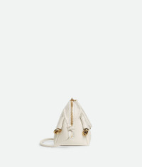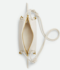 Smooth calfskin leather pouch with adjustable coaxial strap and signature metallic Product Details - One main compartment, one interior flat pocket - Zip closure with leather zip puller - Adjustable leather coaxial strap with sliding knots - Metallic knot details - Material: calfskin - Lining: Suede - Color: Chalk - Hardware: Muse Brass finish - Height: 11.5 cm | 4.5” - Width: 18.5 cm | 7.3” - Depth: 8.5 cm | 3.3” - Strap drop: 55 cm | 21.7” - Made in: Italy - Product code: 816975VMAUM9104