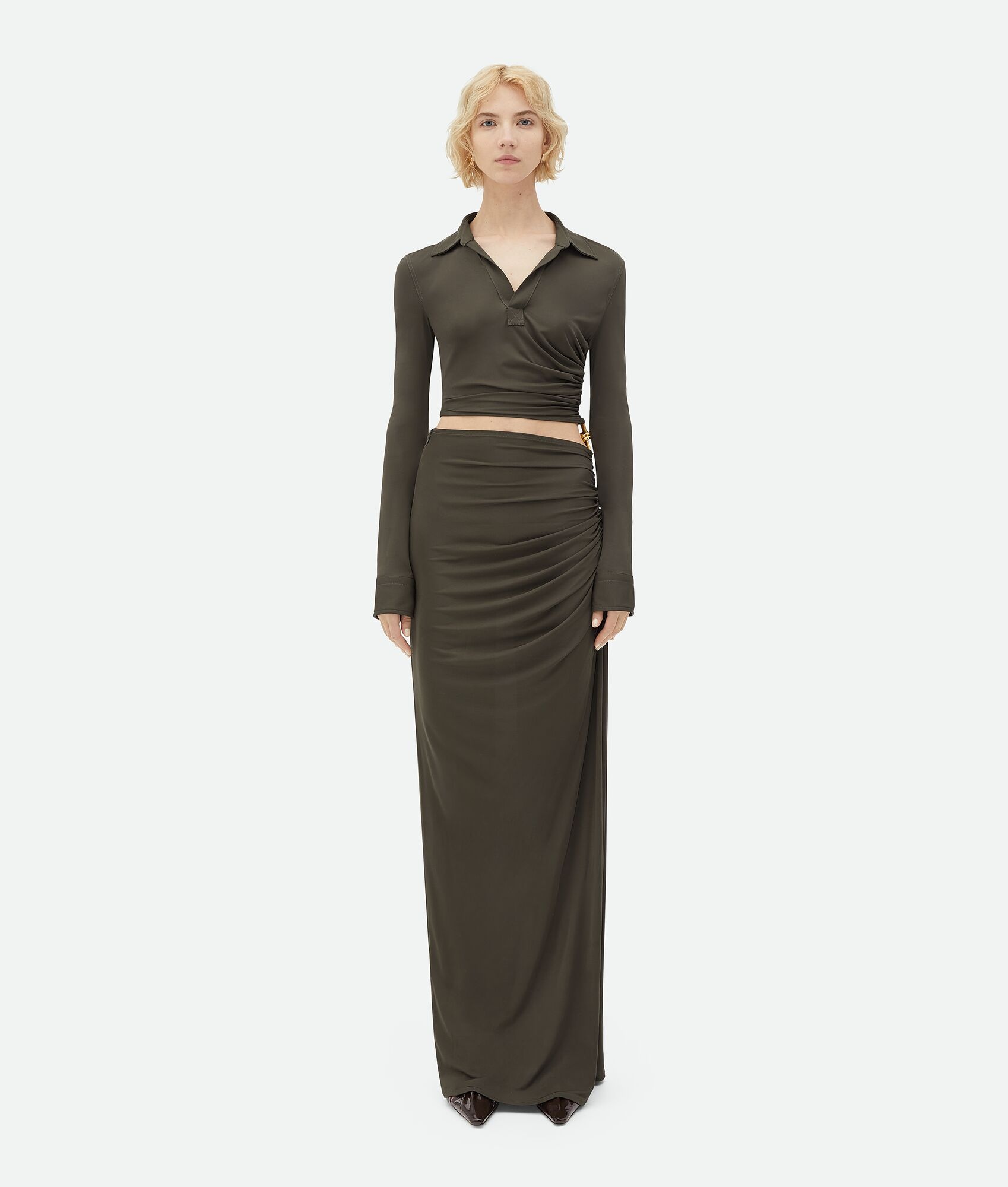 Light viscose jersey long dress. Product details • Light viscose jersey long dress • Metal knot detail • Zip closure • Regular fit Material: 100% Viscose • Color: Olive Made in: Italy Size & fit • Model is 179 cm | 5'10" and is wearing a Bottega Veneta size 38