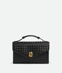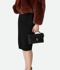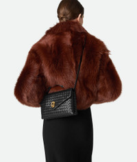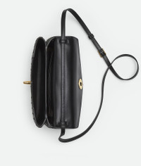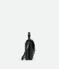 Product Details - Intrecciato piccolo leather cross-body bag - Adjustable top handle - Adjustable and detachable strap - Two compartments, four card slots and an external flat back pocket - Metallic knot lock closure - Lining: Lambskin - Color: Black - Hardware: Brass finish - Made in: Italy - Product code: 817191V08Z01019 Material - Material: Lambskin Size & Fit - Height: 16 cm | 6.3" - Width: 25 cm | 9.8" - Depth: 5.5 cm | 2.2" - Handle drop: 12 cm | 4.7 - Strap drop: 46 cm | 18.1"