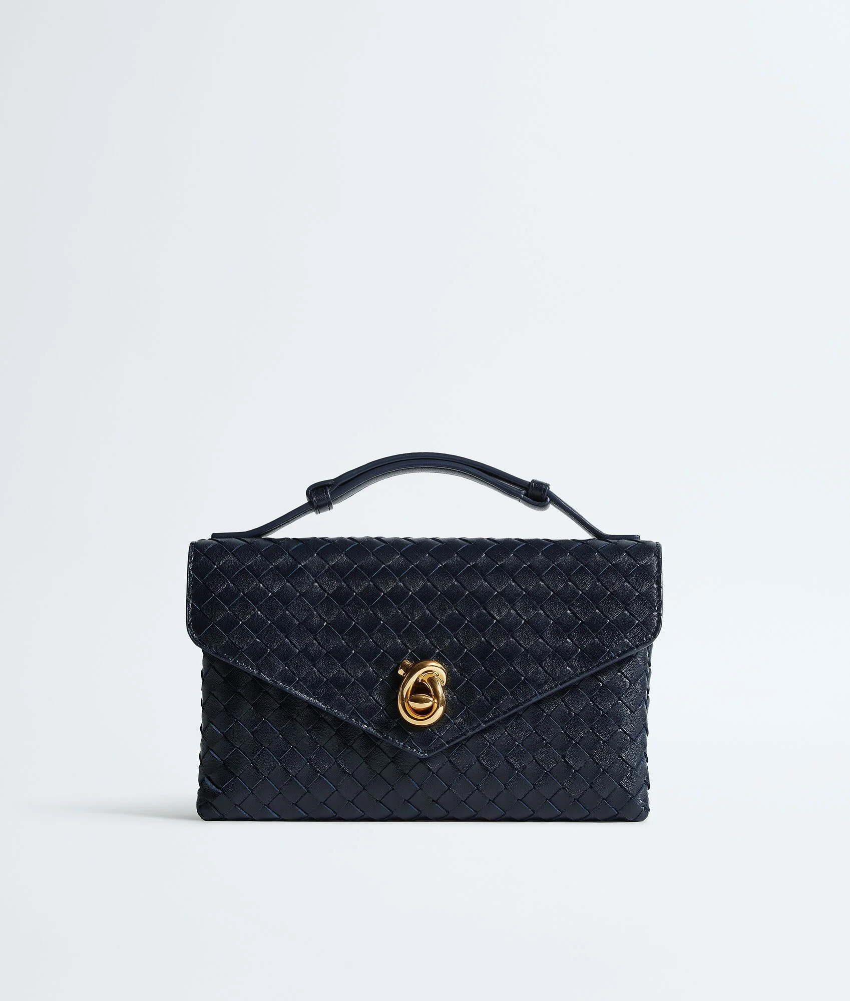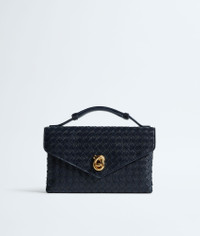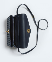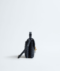 Product Details - Intrecciato leather cross-body bag - Adjustable top handle - Adjustable and detachable strap - Two compartments, four card slots and an external flat back pocket - Metallic knot lock closure - Lining: Lambskin - Color: Midnight - Hardware: Brass finish - Made in: Italy - Product code: 817191V08Z04338 Material - Material: lambskin Size & Fit - Height: 16 cm | 6.3" - Width: 25 cm | 26.6" - Depth: 5.5 cm | 2.2" - Handle drop: 12 cm | 4.7" - Strap drop: 46 cm | 18.1"