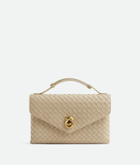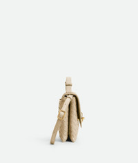 Cross-body bag in Intrecciato leather with adjustable top handle and signature metallic Product Details - Intrecciato leather cross-body bag - Adjustable top handle - Adjustable and detachable strap - Two compartments, four card slots and an external flat back pocket - Metallic knot lock closure - Material: Lambskin - Lining: Lambskin - Color: Ecru - Hardware: Brass finish - Height: 16 cm | 6.3" - Width: 25 cm | 9.8" - Depth: 5.5 cm | 2.2" - Handle drop: 12cm - Strap drop: 46 cm | 18.1" - Made in: Italy - Product code: 817191V08Z09614