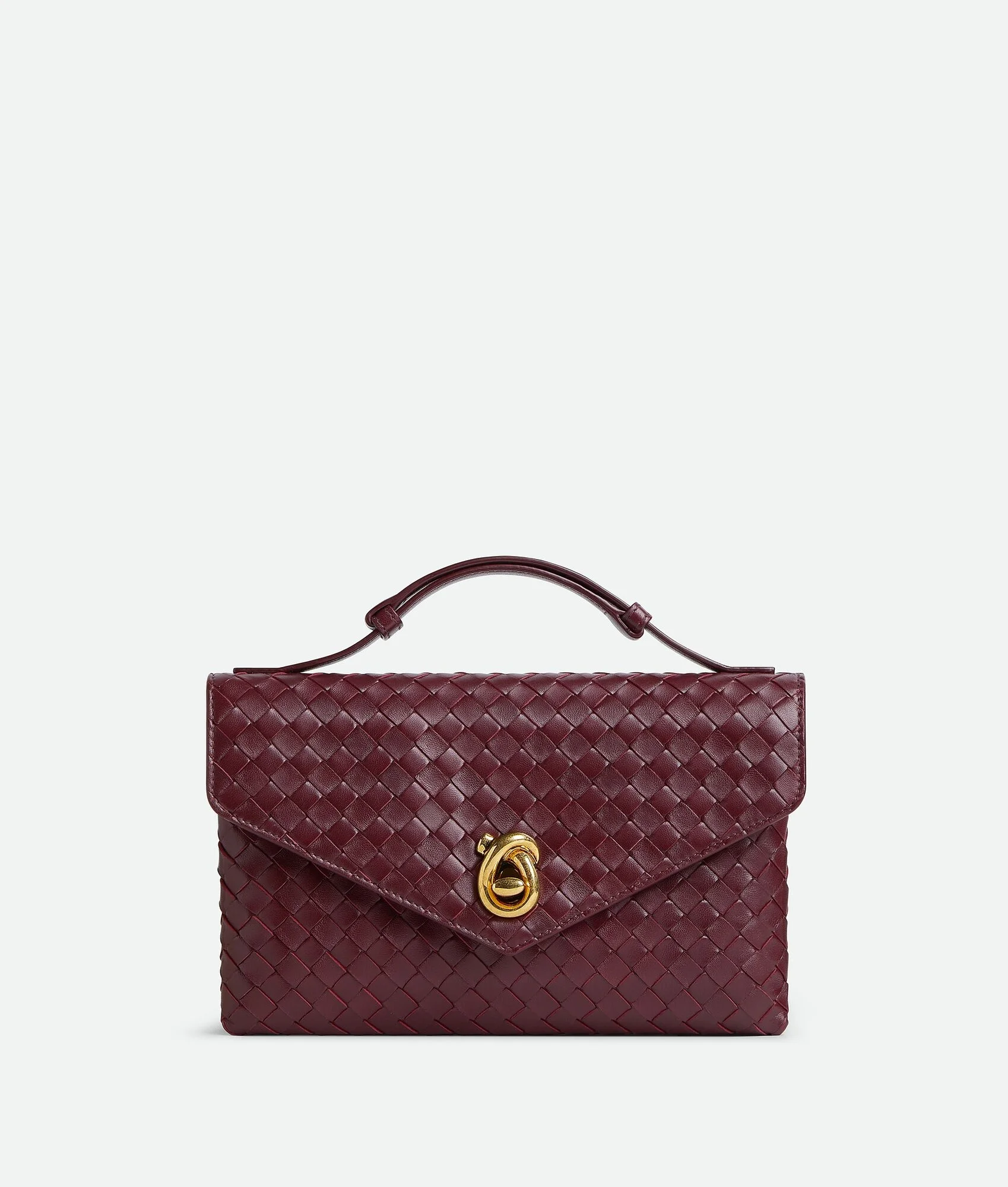 Cross-body bag in Intrecciato piccolo leather with adjustable top handle and sculptural Product Details - Intrecciato piccolo leather cross-body bag - Adjustable top handle - Adjustable and detachable strap - Two compartments, four card slots and an external flat back pocket - Metallic knot lock closure - Material: Lambskin - Lining: Lambskin - Color: Barolo - Hardware: Brass finish - Height: 16 cm | 6.3" - Width: 25 cm | 9.8" - Depth: 5.5 cm | 2.2" - Handle drop: 12 cm | 4.7" - Strap drop: 46 cm | 18.1" - Made in: Italy - Product code: 817191V08Z02250