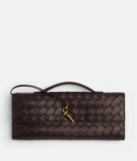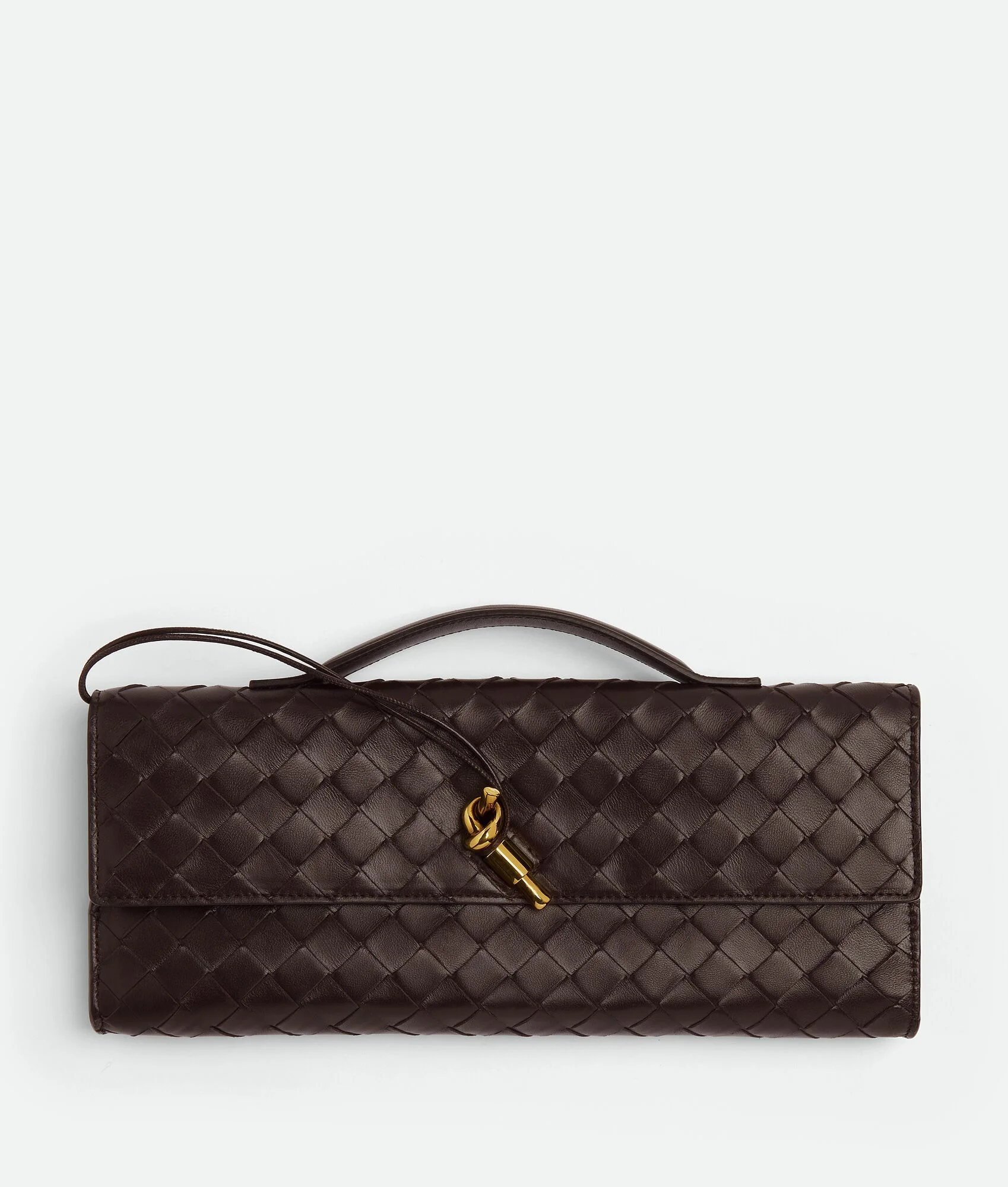 Top handle clutch in supple Intrecciato leather with signature knot closure. Product Details - Intrecciato leather top handle clutch with metallic knot closure - Six card slots, one additional pocket - Material: lambskin, calfskin - Lining: Calfskin - Color: Fondant - Hardware: Brass finish - Height: 13 cm | 5.1" - Width: 31 cm | 12.2" - Depth: 3 cm | 1.2” - Made in: Italy - Product code: 741511VCPP32190 Size & Fit - Fits iPhone 15 Pro Max, a credit card case, airpods and keys.