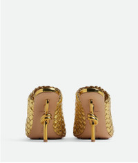 Mule with gold finished metal knot heel. Realised in soft lambskin with a leather Product Details - Intreccio reflective leather mule - Signature knot galvanized heel - Material: Calfskin - Unlined - Color: Gold - Hardware: Brass finish - Heel: 9 cm | 3.5" - We recommend to take half a size up - Made in: Italy - Product code: 754143V3MJ08265