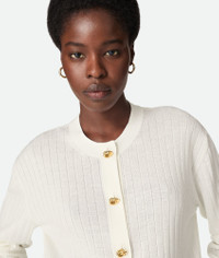 Cardigan in lightweight wool rib with knot button detailing. Product Details - Lightweight wool rib cardigan - Metal knot buttons - Regular fit - Color: Chalk - Made in: Italy - Product code: 835337V5L709071 Size & Fit - Model is 179 cm | 5'10" and is wearing a Bottega Veneta size S