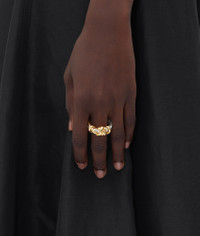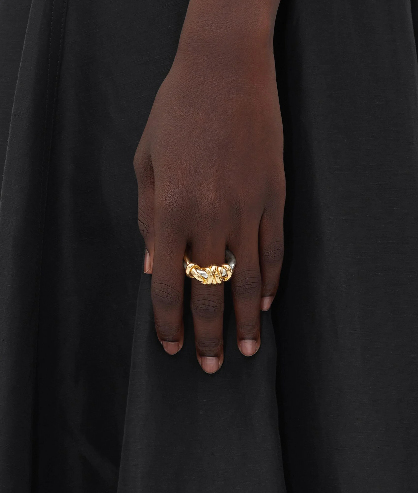 Ring with signature knot shape crafted in contrasting 18k gold-finished sterling Product Details - 18k gold-finish sterling silver ring - Thickness: 12 mm | 0.5" - Width: 14 mm | 0.6" - Material: Sterling silver - Color: Silver/Yellow Gold - Made in: Italy - Product code: 795806V507D8119