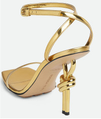 Ankle strap sandal with galvanised metal knot heel. Realised in reflective lambskin. Product Details - Reflective leather ankle strap sandal - Signature knot galvanized heel - Material: Lambskin - Lining: Reflective lambskin - Color: Gold - Hardware: Brass finish - Heel: 9 cm | 3.5" - Made in: Italy - Product code: 775470V3VO08265