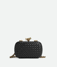 Minaudiere clutch in padded Intrecciato leather with signature knot closure and cross-body Product details • Padded Intreccio leather minaudière with cross-body leather braided metal chain • Single compartment • Metallic knot clasp closure Material: 100% Lambskin • Lining: Lambskin • Color: Black • Hardware: Brass finish • Height: 11.5 cm | 4.5" • Width: 19 cm | 7.5" • Depth: 5 cm | 2" • Strap Drop: 60 cm | 23.6" Made in: Italy