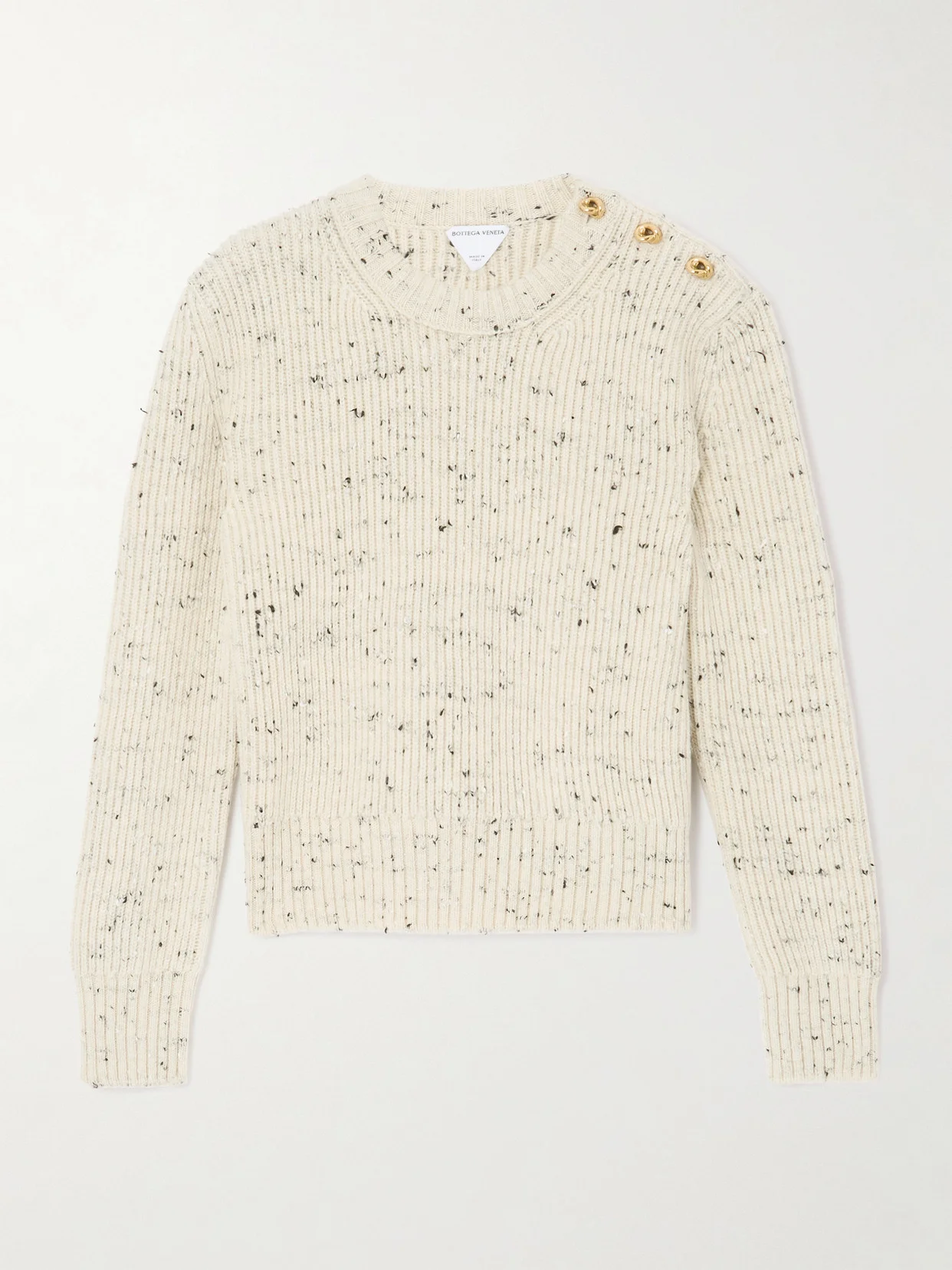 Bottega Veneta's sweater has been knitted in Italy from wool-blend and is flecked with contrasting threads, giving it a marled effect. It has chunky ribs and gold-tone 'Knot' buttons along the shoulder. Lower-Impact Materials. This product is made using at least 50% lower-impact materials or ingredients. Find out more about our NET SUSTAIN criteria here.