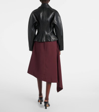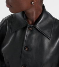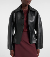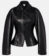 This leather jacket from Bottega Veneta blends an evergreen staple with a modern silhouette. This piece comes with a buttoned front and features a slim, waist-hugging fit contrasted by crescent sleeves. Product Details - Material: 100% lamb leather - Care instructions: specialist clean - Made in Italy - Designer color name: Black - Item color: black - Lining: 100% viscose - Contains non-textile parts of animal origin - Closure: buttoned front - Includes: garment bag - Item number: P01057286 Size & Fit - True to size - Cinched waist - Non-stretchy fabric - Slightly cropped - The model seen in the picture is 178cm-5'10" and wearing a size IT 40