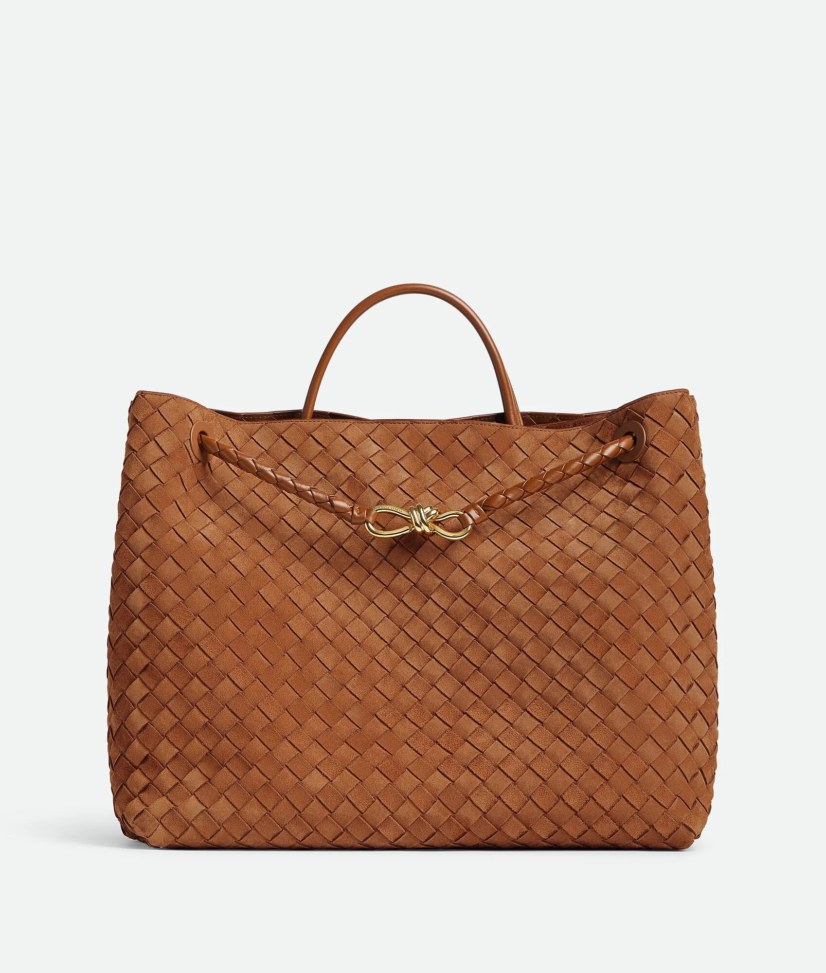 Product Details - Large Intrecciato suede top-handle bag with sliding cross-body strap - Compartmented interior with one zipped pocket, two open pockets - Magnetic closure - Lining: Suede bonded Intrecciato - Color: Amber - Hardware: Brass finish - Made in: Italy - Product code: 766019V1QE62598 Material - Material: Calfskin Size & Fit - Height: 35 cm | 13.8" - Width: 42 cm | 16.5" - Depth: 18 cm | 7.1" - Handle drop: 9 cm | 3.5"" - Strap drop: 45 cm | 17.7"" - Fits a 16" laptop
