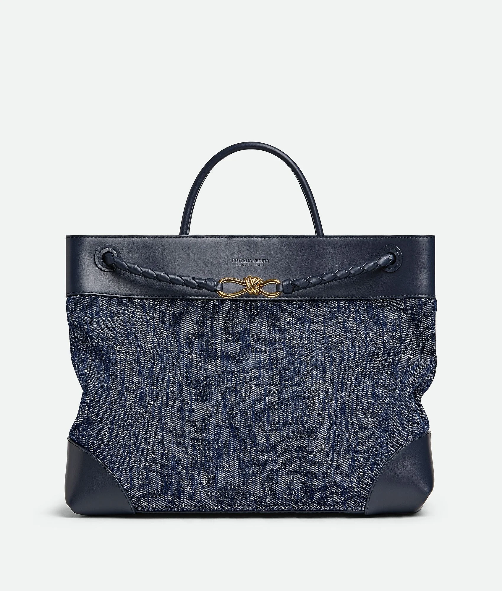 Top handle bag in denim boucle and leather with signature knot detail and sliding Product Details - Large denim boucle top handle bag with sliding cross-body strap - Compartmented interior with one zippered pocket, two open pockets - Magnetic closure - Material: denim boucle, calfskin - Lining: Calfskin - Color: Navy-White-Space - Hardware: Brass finish - Height: 35 cm | 13.8” - Width: 42 cm | 16.5” - Depth: 18 cm | 7.1” - Handle drop: 9 cm | 3.5” - Strap drop: 45 cm | 17.7” - Made in: Italy - Product code: 786194V52M18768