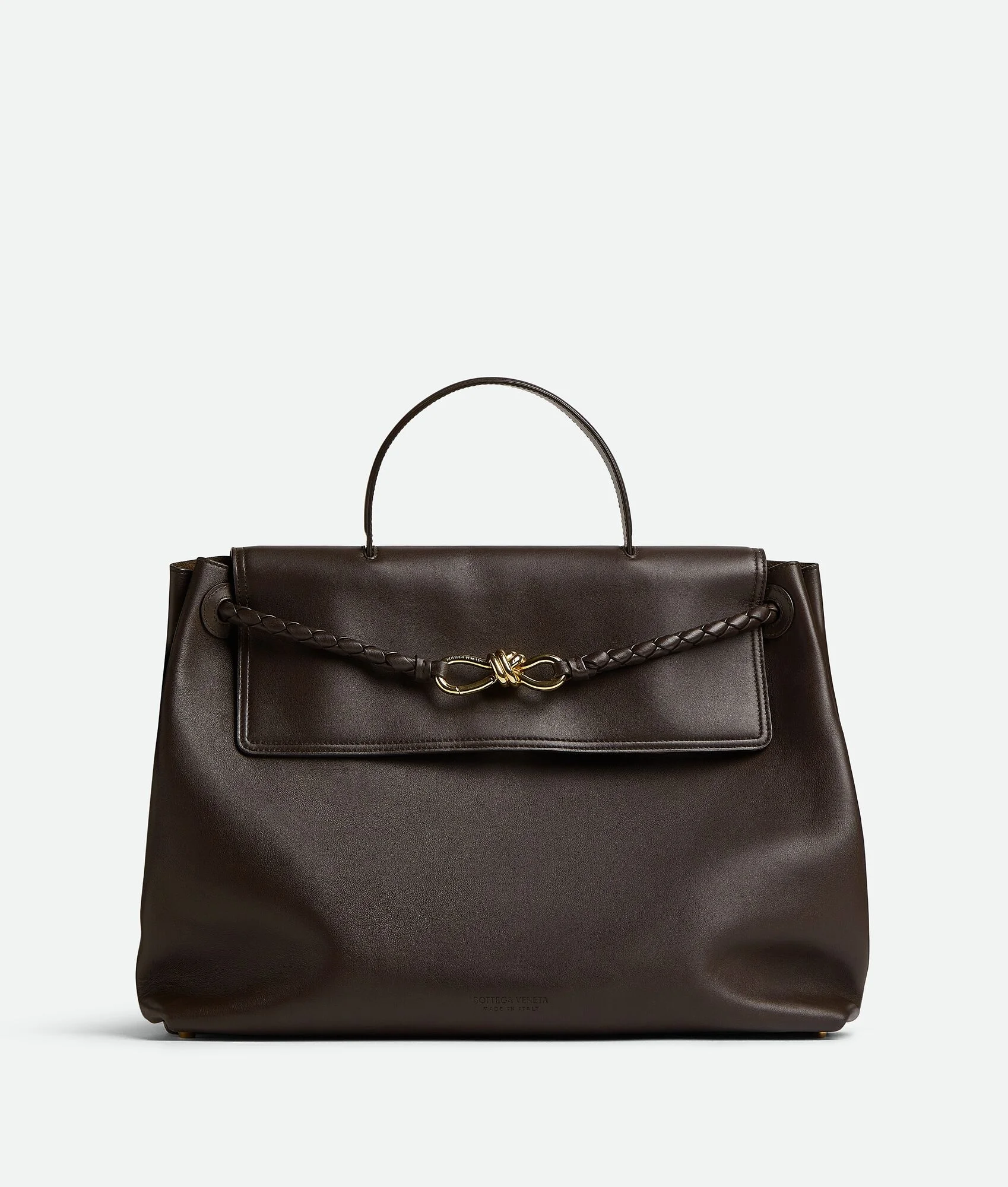 Top handle bag in silky calf leather with two-way flap and signature knot detail. Product Details - Large silky calfskin leather top handle bag with two-way flap - Sliding shoulder carry strap - Adjustable and detachable cross-body strap - Compartmented interior with one zipped pocket - Hook closure - Material: Calfskin - Lining: Bonded suede - Color: Fondant - Hardware: Brass finish - Height: 32cm - Width: 41.5cm - Depth: 14.5cm - Handle drop: 11cm - Strap drop: 45 cm | 17.7" - Made in: Italy - Product code: 826195V4O922190