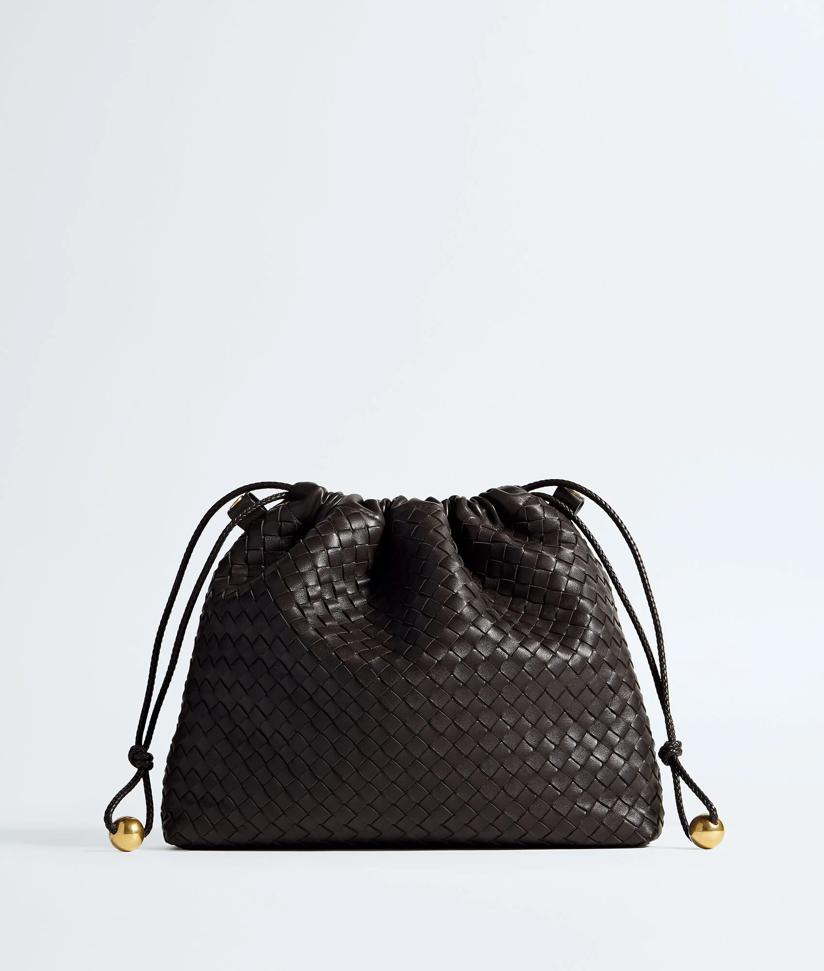 Product Details - Large Intrecciato nappa leather pouch - One main compartment - Drawstring closure with two metal spheres - Snap button attachments - Colour: Espresso - Hardware: Brass Vibrato finish - Lining: Canvas - Made in: Italy - Product code: 868502V5KD02094 Material - Material: lambskin Size & Fit - Height: 26.5 cm | 10.4" - Width: 30 cm | 11.8" - Depth: 6 cm | 2.4"