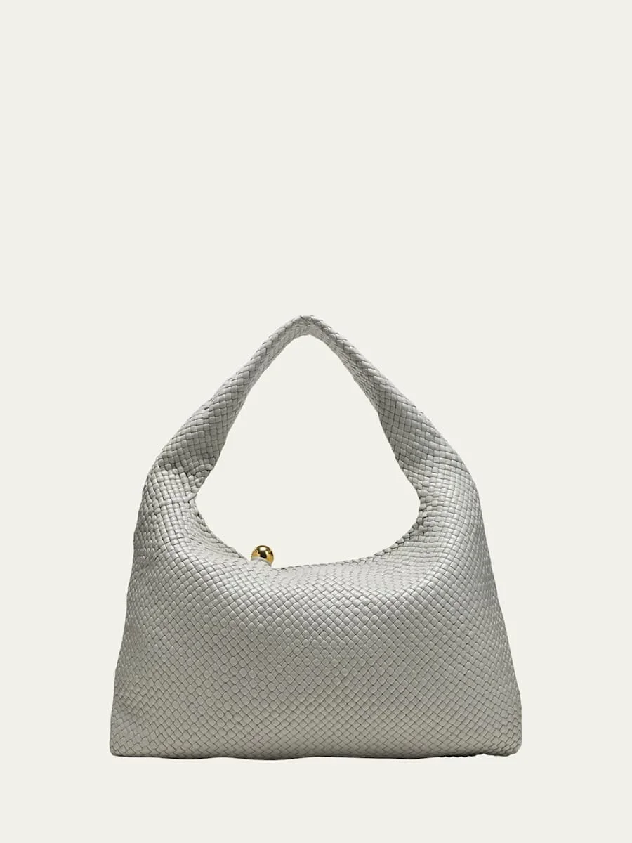 Bottega Veneta "Hop" hobo shoulder bag in intrecciato leather Integrated shoulder strap Open top with button closure Lining: Unlined Approx. 15.6"H x 21.3"W x 2.4"D Made in Italy Online Inquiries: BGS21_V60XE| Store Inquiries: #4638080