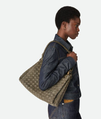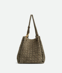 Shoulder bag in supple Intrecciato suede with signature knot detail. Product Details - Large Intrecciato suede shoulder bag - One main compartment - Single detachable interior zipped pocket - Magnetic tab closure - Lining: Lambskin bonded Intrecciato - Color: Cypress - Hardware: Brass finish - Height: 26 cm | 10.2" - Width: 30 cm | 11.8" - Depth: 20 cm | 7.9" - Handle drop: 25 cm | 9.8" - Made in: Italy - Product code: 805090V1QE93230