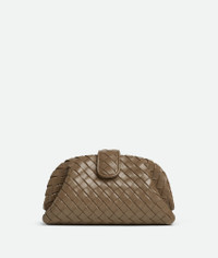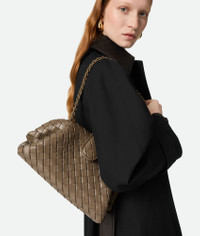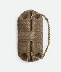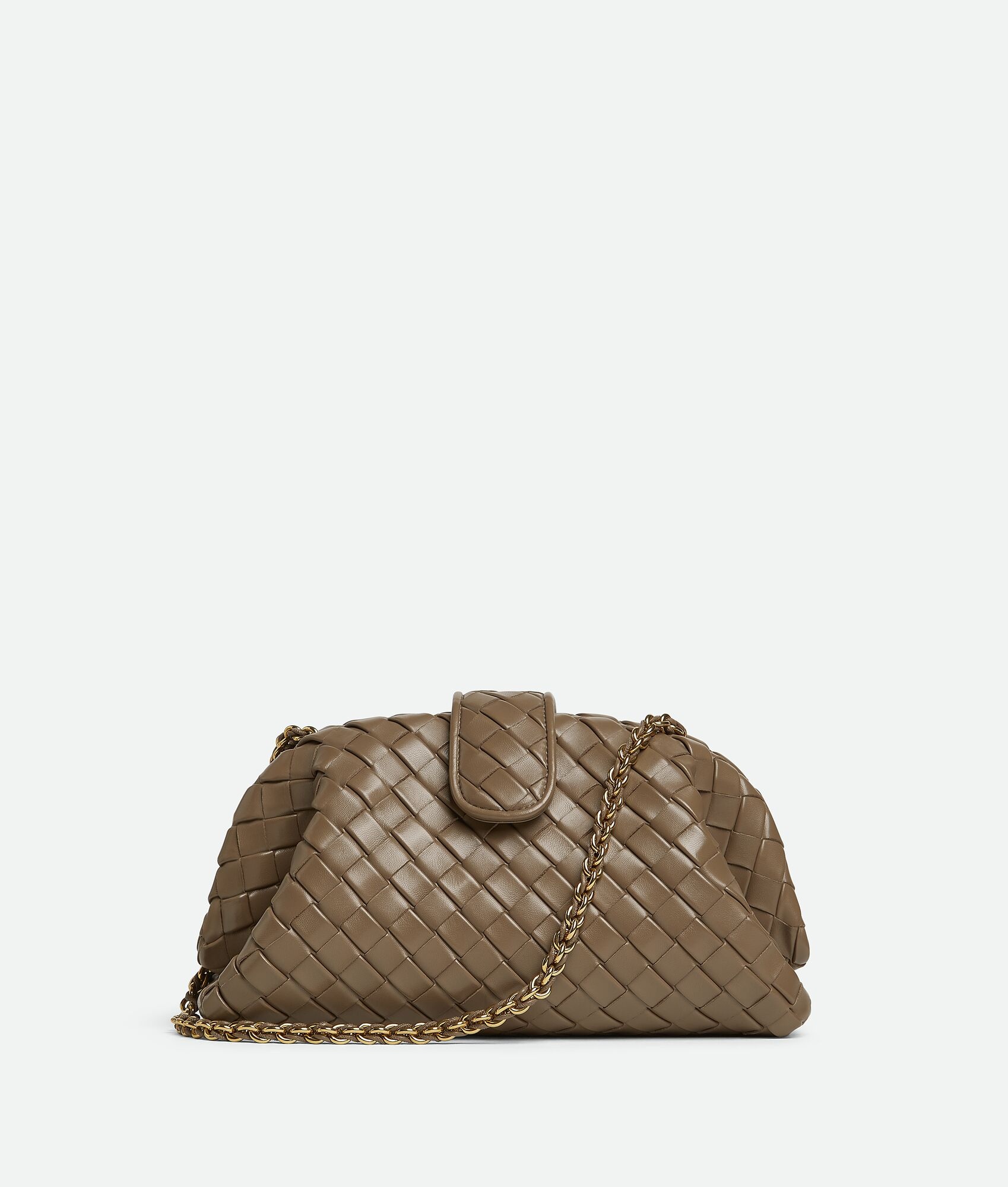 Lauren 1980 clutch in padded Intrecciato leather with tubular leather braided metal Product Details - Padded Intrecciato leather clutch with leather braided metal chain - Single compartment - Magnetic flap closure - Material: lambskin - Lining: Lambskin - Color: Pinecone - Hardware: Brass finish - Height: 16 cm | 6.3" - Width: 31 cm | 12.2” - Depth: 10 cm | 3.9” - Strap Drop: 28 cm | 11” - Made in: Italy - Product code: 785807V40Z12360