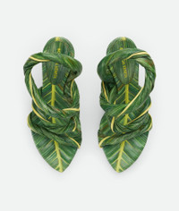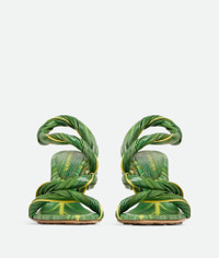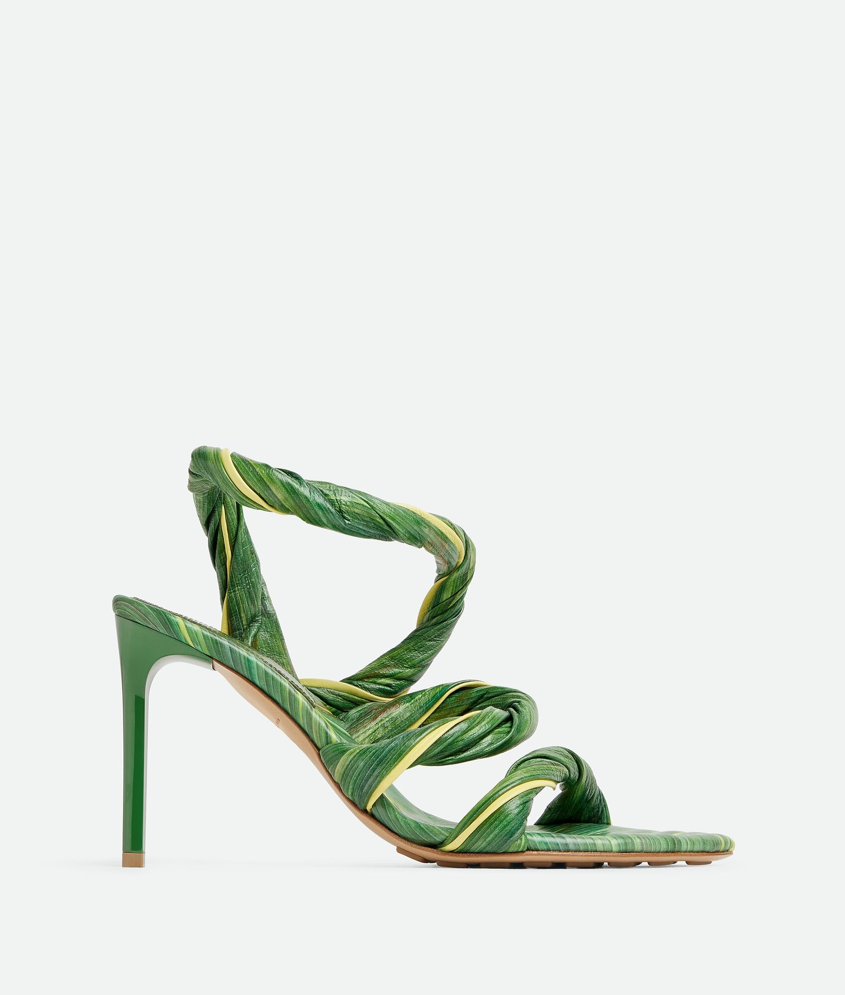 Tropical leaf printed leather sandal with tubular ankle straps. Product details • Ankle strap sandal in embossed and printed leather with tropical leaf effect Material: Calfskin • Unlined • Color: Raintree/Seagrass • Rubber-injected leather outsole • Heel: 9 cm | 3.5” Made in: Italy