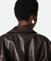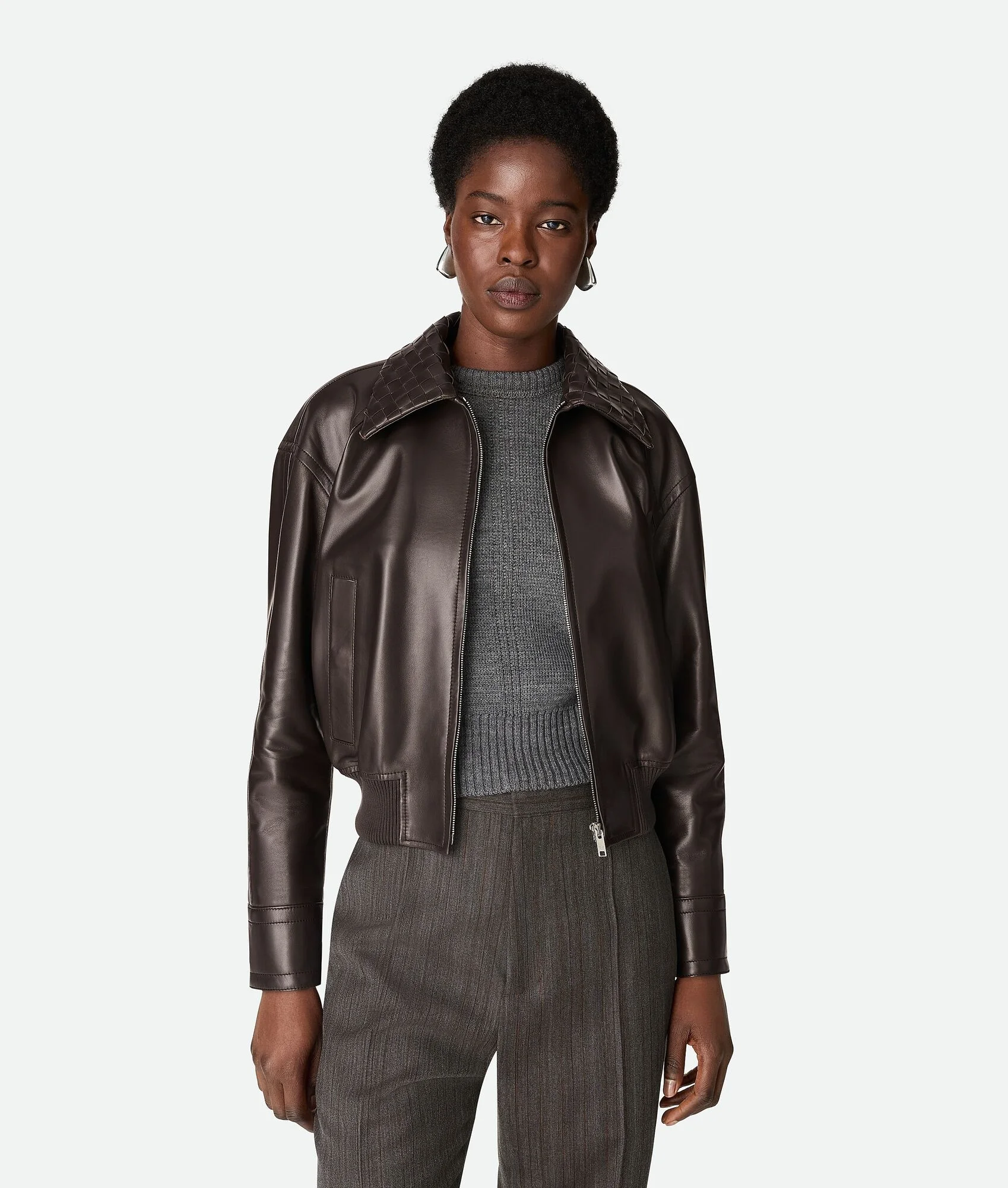 Blouson in midweight soft nappa lambskin with Intrecciato leather collar. Product Details - Midweight soft nappa lambskin blouson - Intrecciato leather collar - Zip closure - Fully lined in check - Regular fit - Material: 100% Lambskin - Color: Fondant - Made in: Italy - Product code: 832893V5BX02113 Size & Fit - Model is 179 cm | 5'10" and is wearing a Bottega Veneta size 38