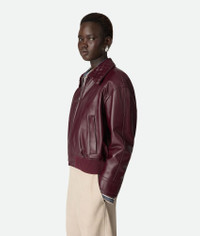 Blouson in midweight soft nappa lambskin with Intrecciato leather collar. Product Details - Midweight soft nappa lambskin blouson - Intrecciato leather collar - Zipper closure - Fully lined in check - Regular fit - Color: Jam - Made in: Italy - Product code: 832893V5BX06206 Material - Material: 100% Lambskin Size & Fit - Model is 179 cm | 5'10" and is wearing a Bottega Veneta size 38