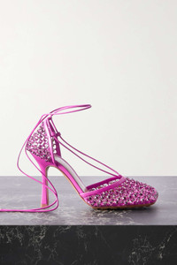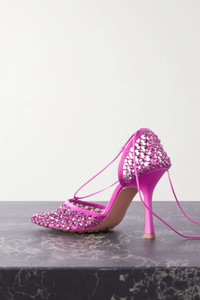 EDITORS'NOTES It’s impossible to miss Bottega Veneta's embellished pumps. Intricately studded with crystals, they have a threaded lace-through fastening which ties and wraps around the calf. The soft 'Hollyhock' leather means you'll be comfortable all day and night long. SIZE & FIT - Fits true to size, take your normal size - Those with narrow feet may wish to take the next size down - Italian sizing DETAILS & CARE - Heel measures approximately 90mm/ 3.5 inches - Fuchsia woven and leather (Lamb) - Ties at calf - Designer color: Hollyhock