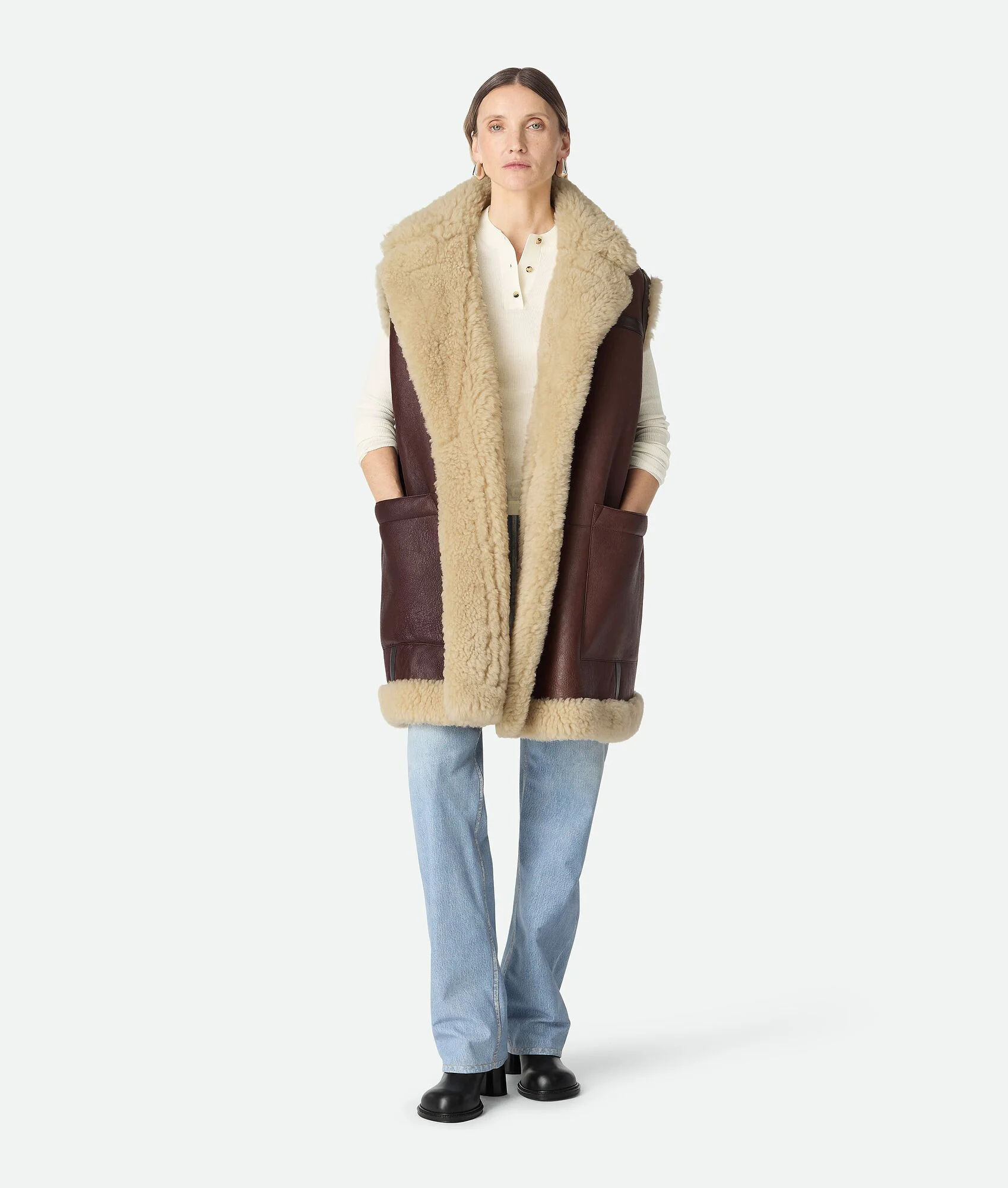 Gilet realised in crackled effect leather and soft shearling. Product Details - Crackled-effect leather and shearling gilet - Leather tie closure - Relaxed fit - Color: Madder Brown/Birch - Made in: Italy - Product code: 832381V5VK08979 Material - Material: 100% Lambskin Size & Fit - Model is 177 cm | 5'9" and is wearing a Bottega Veneta size 38