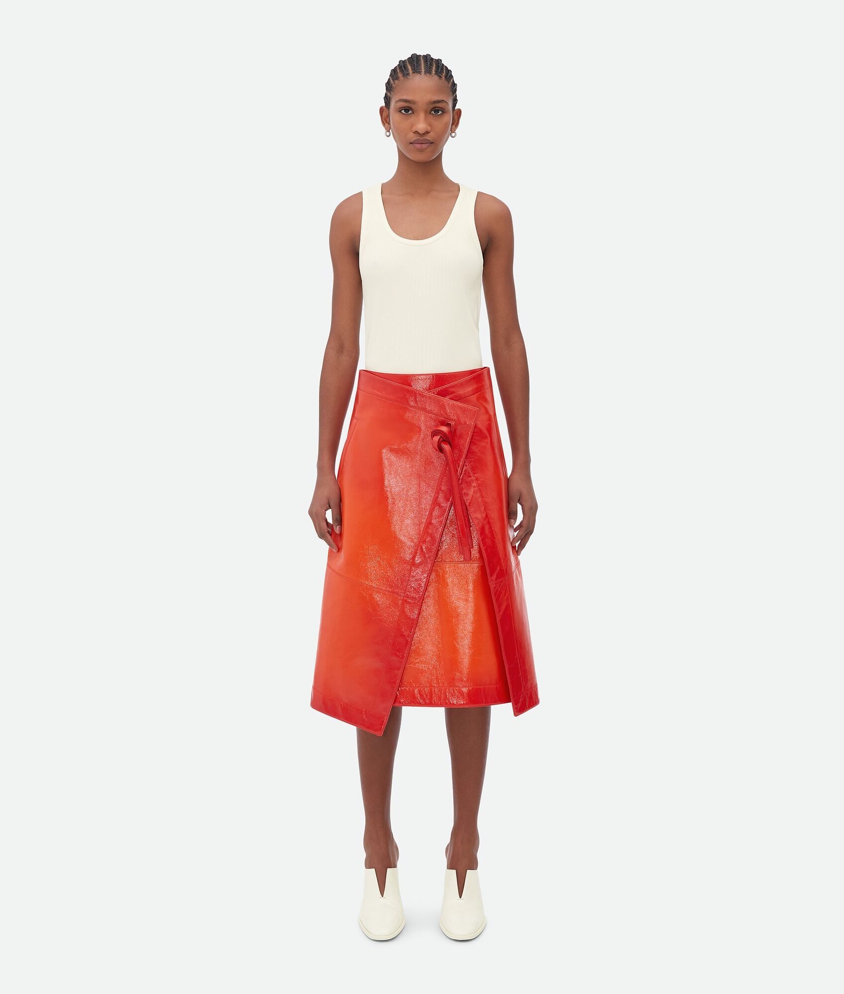 Product details • Shiny leather wrapped midi skirt • Hand-made degradé effect • Knot detail • Zip closure Material: 100% Lambskin • Color: Burst Made in: Italy Size & fit • Model is 180 cm | 5'11" and is wearing a Bottega Veneta size 38