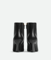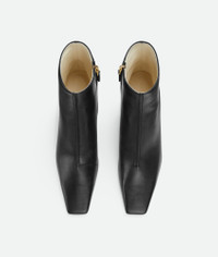 Ankle boot in calfskin leather with sculptural sloped heel and elongated silhouette. Product Details - Leather ankle boot - Side zip closure - Material: calfskin - Lining: Lambskin - Color: Black - Leather outsole - Heel: 7.5 cm | 3” - Made in: Italy - Product code: 806734V4Q501000