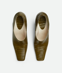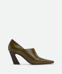 Pump in crocodile effect leather with sculptural sloped heel and elongated silhouette. Product Details - Crocodile effect leather pump - Material: calfskin - Lining: Lambskin - Color: Olive Oil - Leather outsole - Heel: 7.5 cm | 3” - Made in: Italy - Product code: 806723V4PB03310