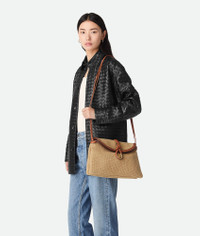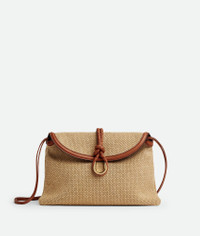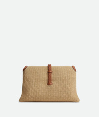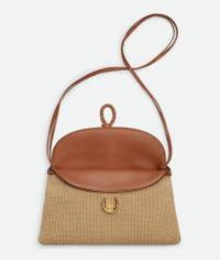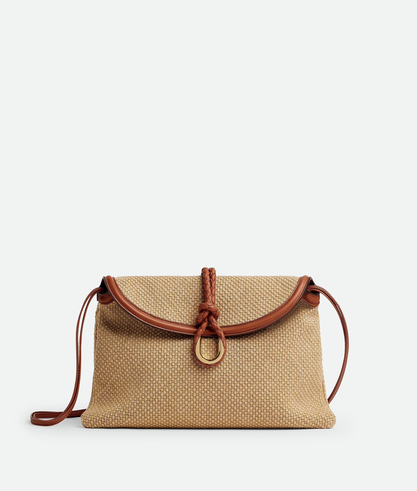 Cross-body bag in jute and leather with double flap. Fastened with a sculptural metal Product Details - Cross-body bag in jute and leather with double flap and fastening system consisting of metal elements and coaxial cord - Single interior zippered pocket - Material: jute, calfskin - Lining: Canvas - Color: Cane Sugar-Light Wood-Fondant - Hardware: Brass finish - Height: 23 cm | 9.1” - Width: 35 cm | 13.8” - Depth: 6 cm | 2.4” - Strap drop: 55 cm | 21.7” - Made in: Italy - Product code: 815354V50R22678