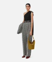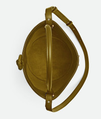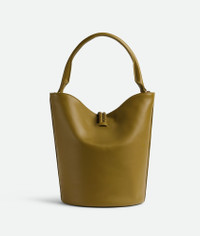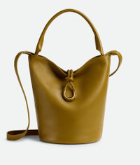 Top handle bucket bag in smooth calf leather with double flap. Fastened with a sculptural Product Details - Top handle bucket bag in smooth calfskin leather with fastening system consisting of metal elements and coaxial cord - Adjustable and detachable strap - Single compartment - Material: calfskin - Lining: Suede - Color: Limonite - Hardware: Brass finish - Height: 30 cm | 11.8” - Width: 18 cm | 7.1” - Depth: 18 cm | 7.1” - Strap Drop: 26 cm | 10.2” - Made in: Italy - Product code: 806038V4SJ17734