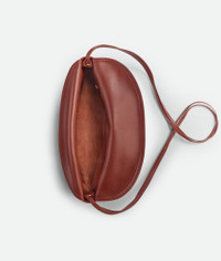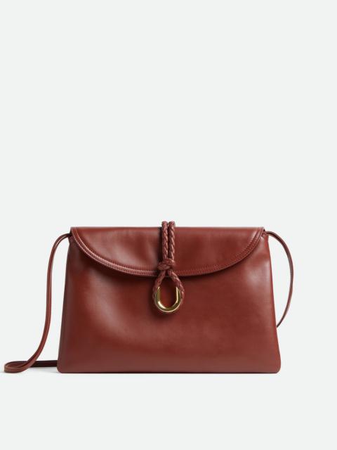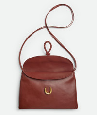 Cross-body bag in smooth calf leather with double flap. Fastened with a sculptural Product Details - Cross-body bag in smooth calfskin leather with double flap and fastening system consisting of metal elements and coaxial cord - Single interior zippered pocket - Material: Calfskin - Lining: Suede - Color: Sapele - Hardware: Brass finish - Height: 20 cm | 7.9" - Width: 35cm - Depth: 8cm - Strap drop: 55cm - Made in: Italy - Product code: 806034V4SJ12506