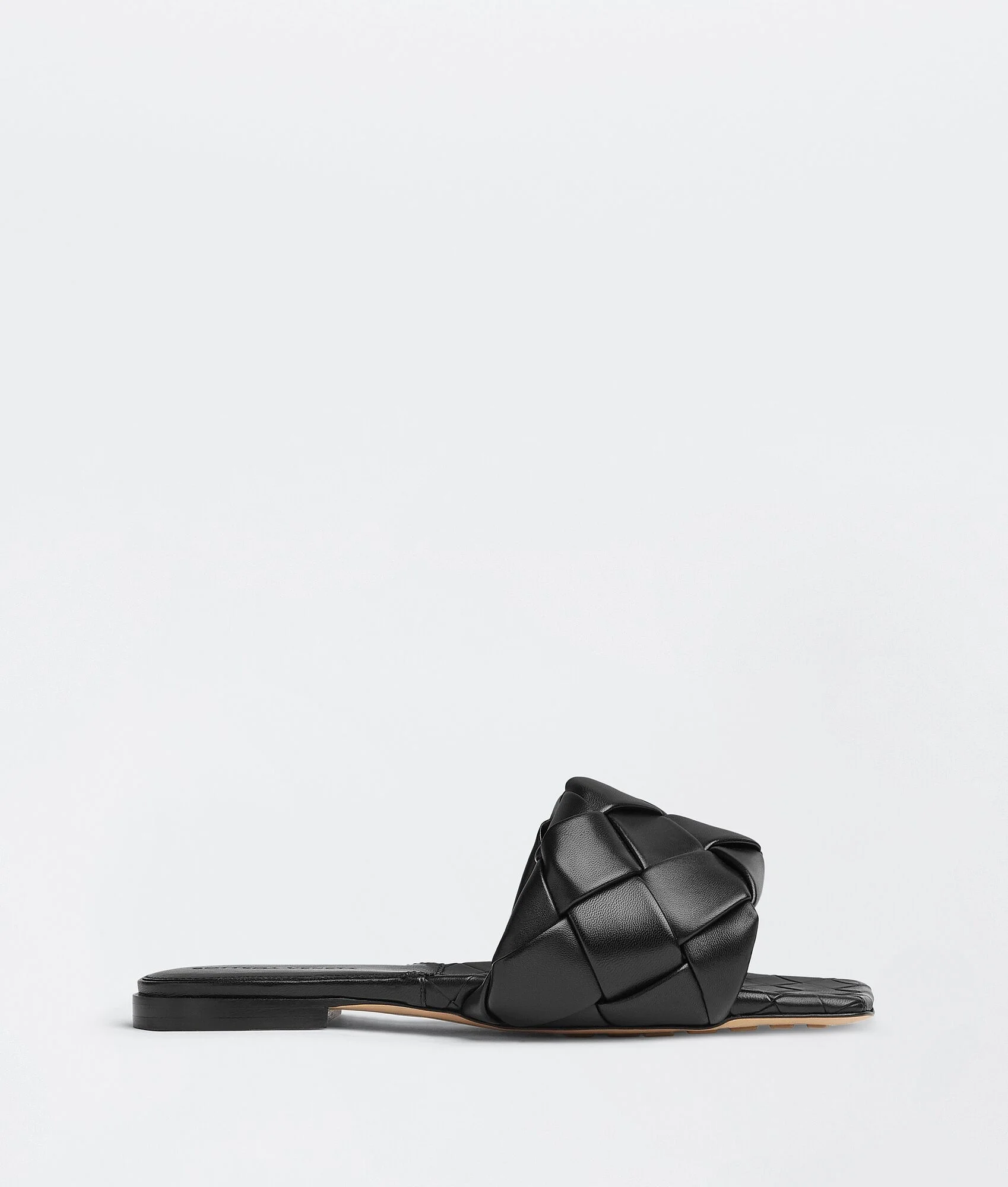 Intrecciato leather flat sandals. Product details • Intrecciato leather flat sandals Material: 100% Lambskin • Lining: Lambskin • Color: Black • Rubber-injected leather outsole Made in: Italy