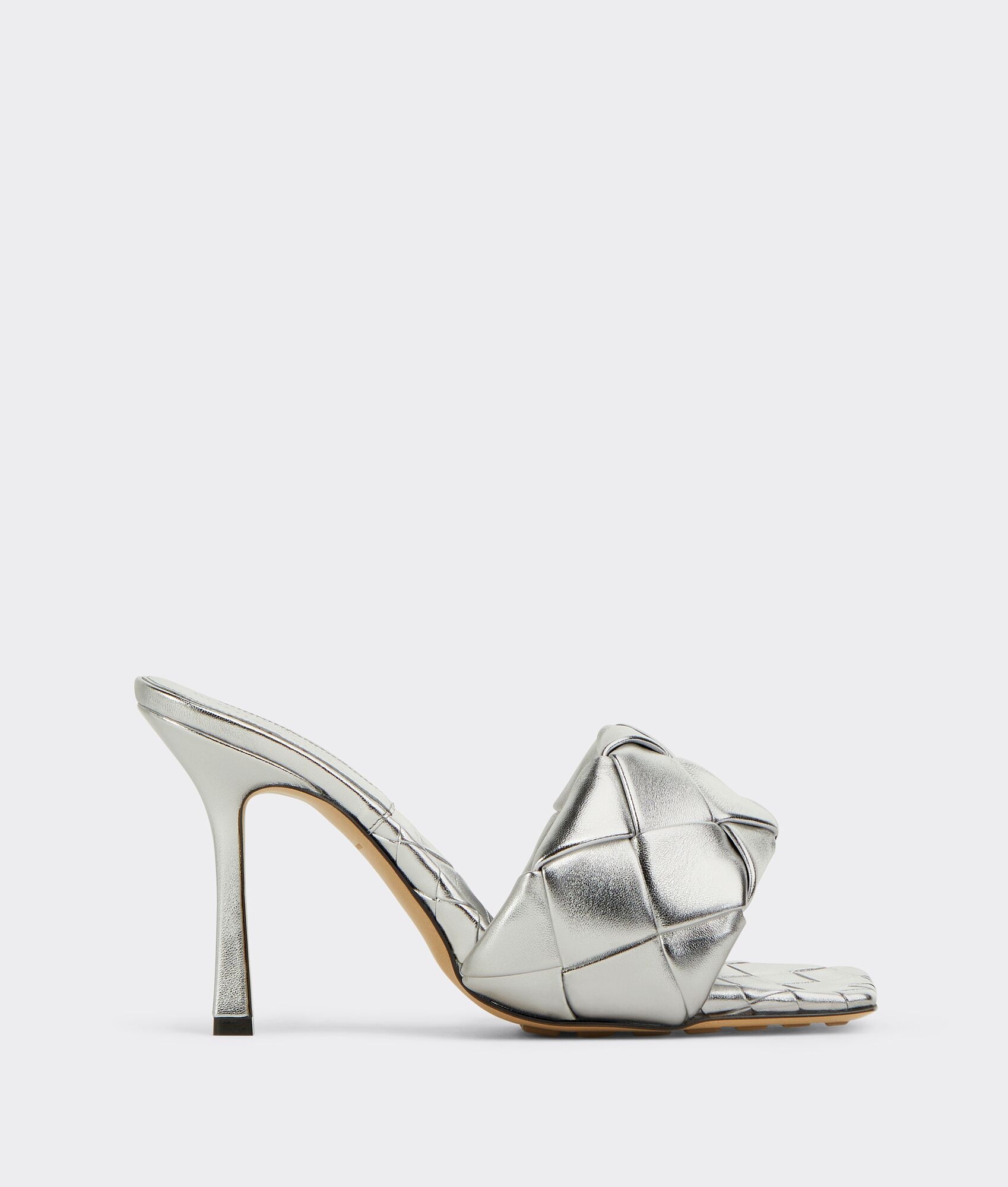 • Intreccio metallized leather mules Material: 100% Lambskin • Lining: Lambskin • Color: Silver • Rubber-injected leather outsole Heel: 9 cm | 3.5" Made in: Italy