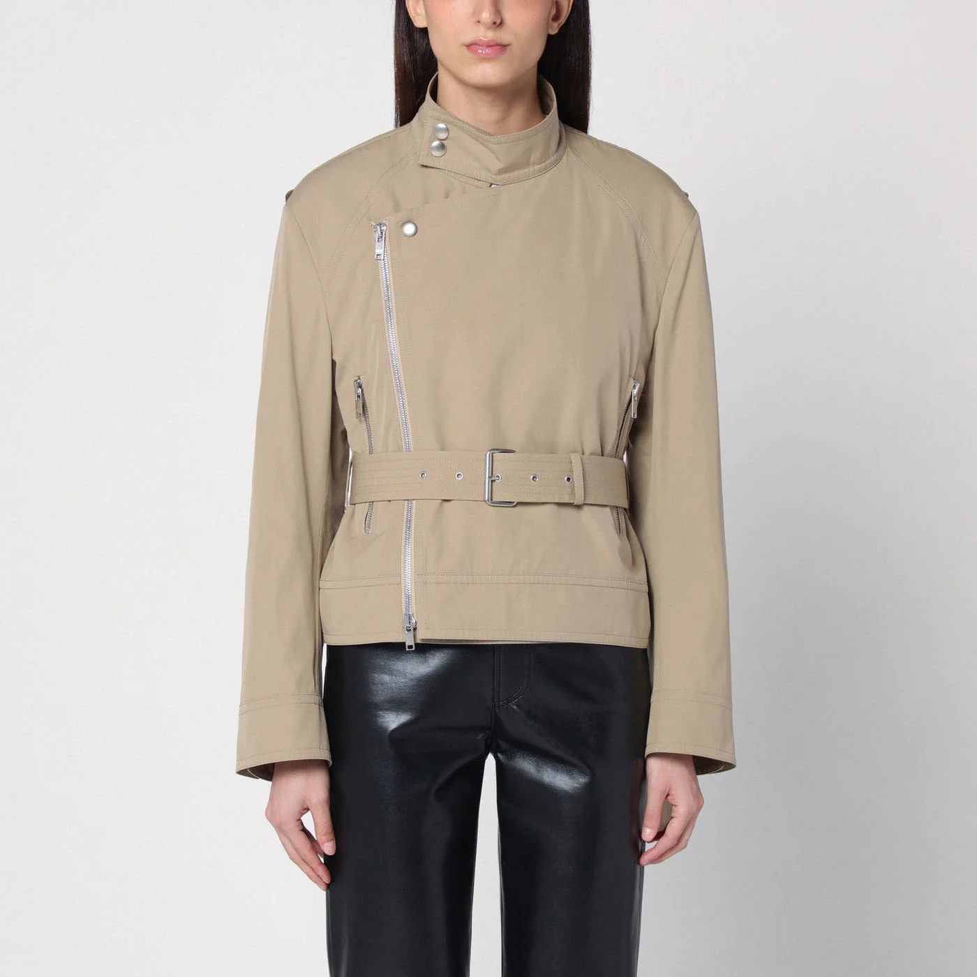 Lightweight jacket by Bottega Veneta in beige cotton-blend featuring a stand-up collar with side snap buttons an off-centre front zip fastening front welt pockets with zips buttoned cuffs and a matching belt at the waist.