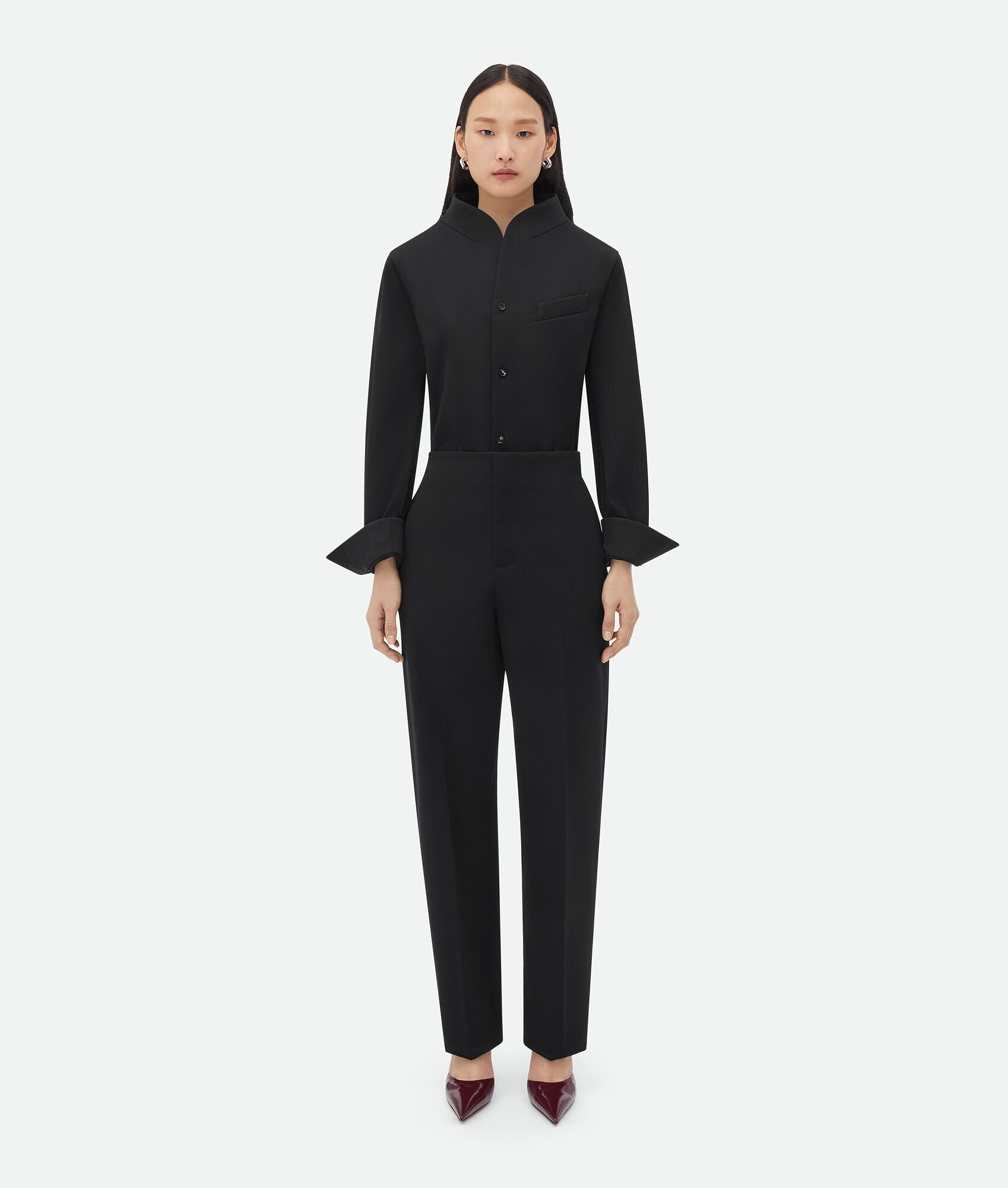 • Light compact stretch wool pants • No belt loop • Zipper, button, and hook closure • Straight leg Material: 99% Wool, 1% Elastane • Color: Black Made in: Italy