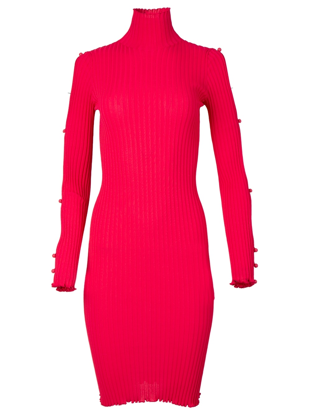 Long sleeve dress from Bottega Veneta crafted from pink rib knit fabric featuring a high neck, curled hems, buttoned cut out details at the arms and a mid length. Pair with pumps and a clutch for an evening dinner look. Dimensions: Model is 5'9"/175cm and is wearing a size S Composition: Knit Care: Dry clean only Brand Style: 670662 V1DO0