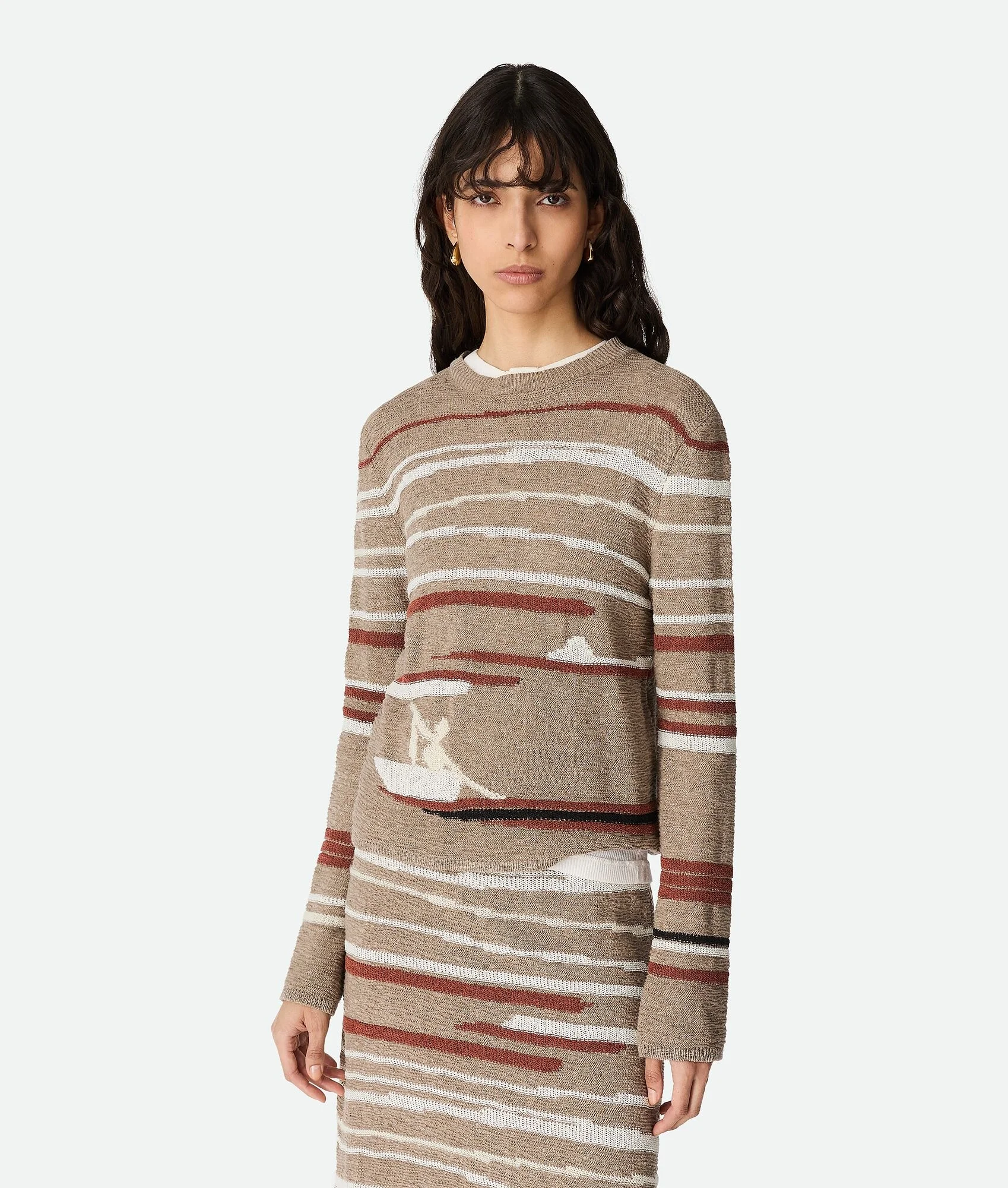 Jumper in lightweight linen and cotton with Venice-inspired intarsia knit design. Product Details - Lightweight linen and cotton graphic sweater - Regular fit - Material: 73% Linen, 27% cotton - Color: Stonemel/Maple/Chalk - Made in: Italy - Product code: 831454V5LW01501 Size & Fit - Model is 178 cm | 5'10" and is wearing a Bottega Veneta size S