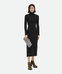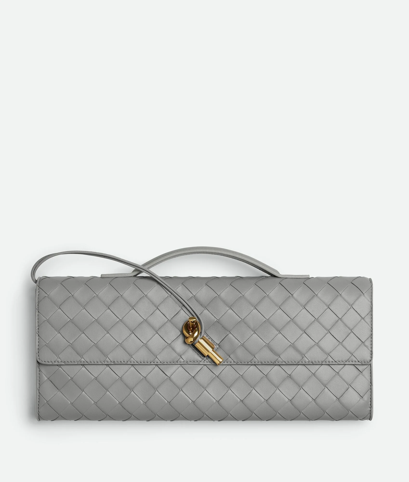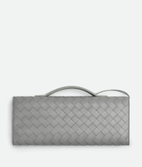 Top handle clutch in supple Intrecciato leather with signature knot closure. Product Details - Intrecciato leather top handle clutch with metallic knot closure - Six card slots, one additional pocket - Material: lambskin, calfskin - Lining: Calfskin - Color: Sterling - Hardware: Brass finish - Height: 13 cm | 5.1" - Width: 31 cm | 12.2" - Depth: 3 cm | 1.2” - Made in: Italy - Product code: 741511VCPP31504 Size & Fit - Fits iPhone 15 Pro Max, a credit card case, airpods and keys.