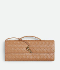 Top handle clutch in Intrecciato leather with signature knot closure. Product Details - Intrecciato leather top handle clutch with metallic knot closure - Six card slots, one additional pocket - Lining: Calf leather - Color: Pale Brown - Hardware: Brass finish - Made in: Italy - Product code: 741511VCPP32788 Material - Material: Lambskin Size & Fit - Height: 13 cm | 5.1" - Width: 31 cm | 12.2" - Depth: 3 cm | 1.2" - Handle drop: 2 cm | 0.8" - Fits iPhone 16 Pro Max, a credit card case, airpods and keys.