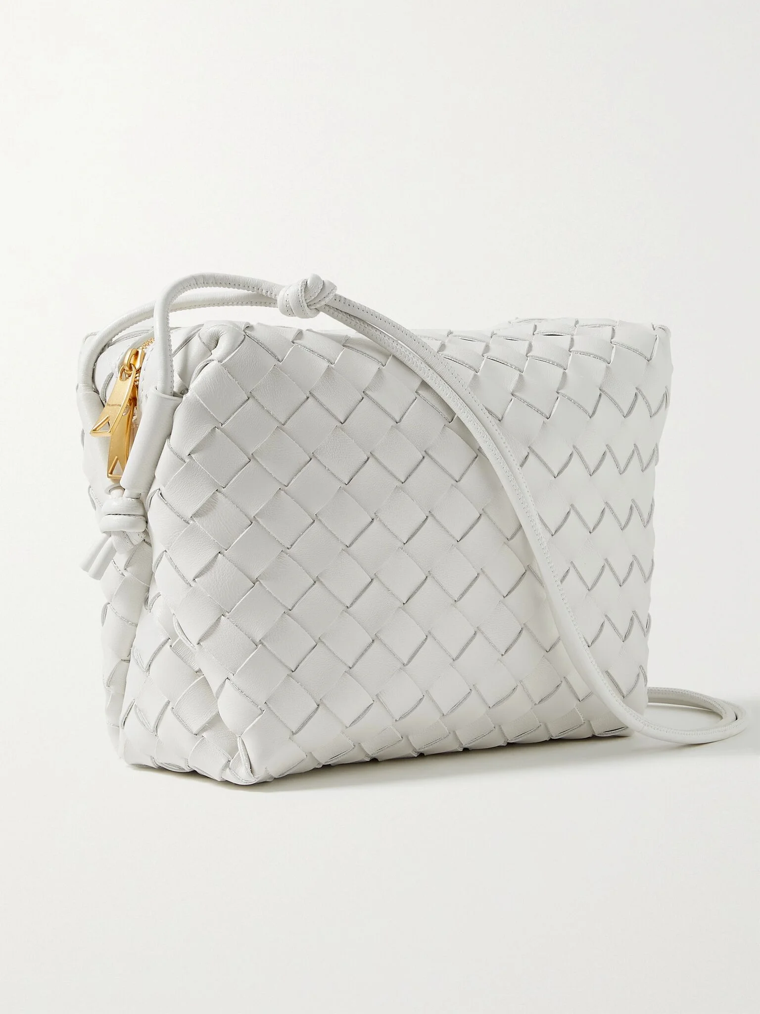Bottega Veneta's 'Loop' shoulder bag has been hand-woven in Italy from strips of supple leather using the house's iconic intrecciato technique. It's sized to fit the essentials and has slim straps detailed with signature knots. Details & Care - White leather (Lamb) - Two-way zip fastening along top - Comes with dust bag - Weighs approximately 3.3lbs/ 1.5kg
