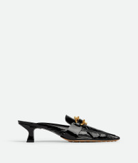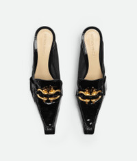 • Patent leather mules Material: 100% Calfskin • Unlined • Color: Black • Hardware: Gold finish • Bio-based rubber-injected and biodegradable leather outsole • Heel: 4.5 cm | 1.8" Made in: Italy