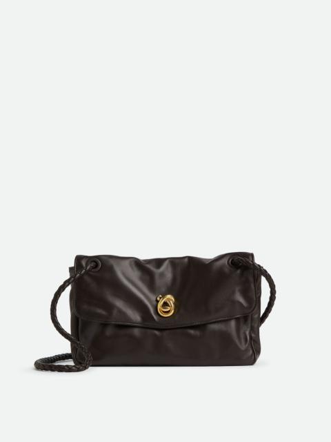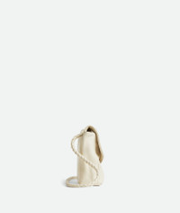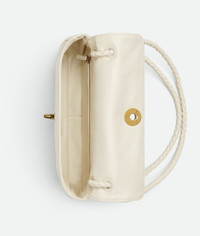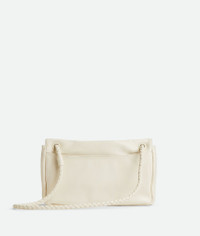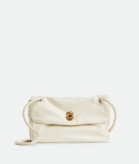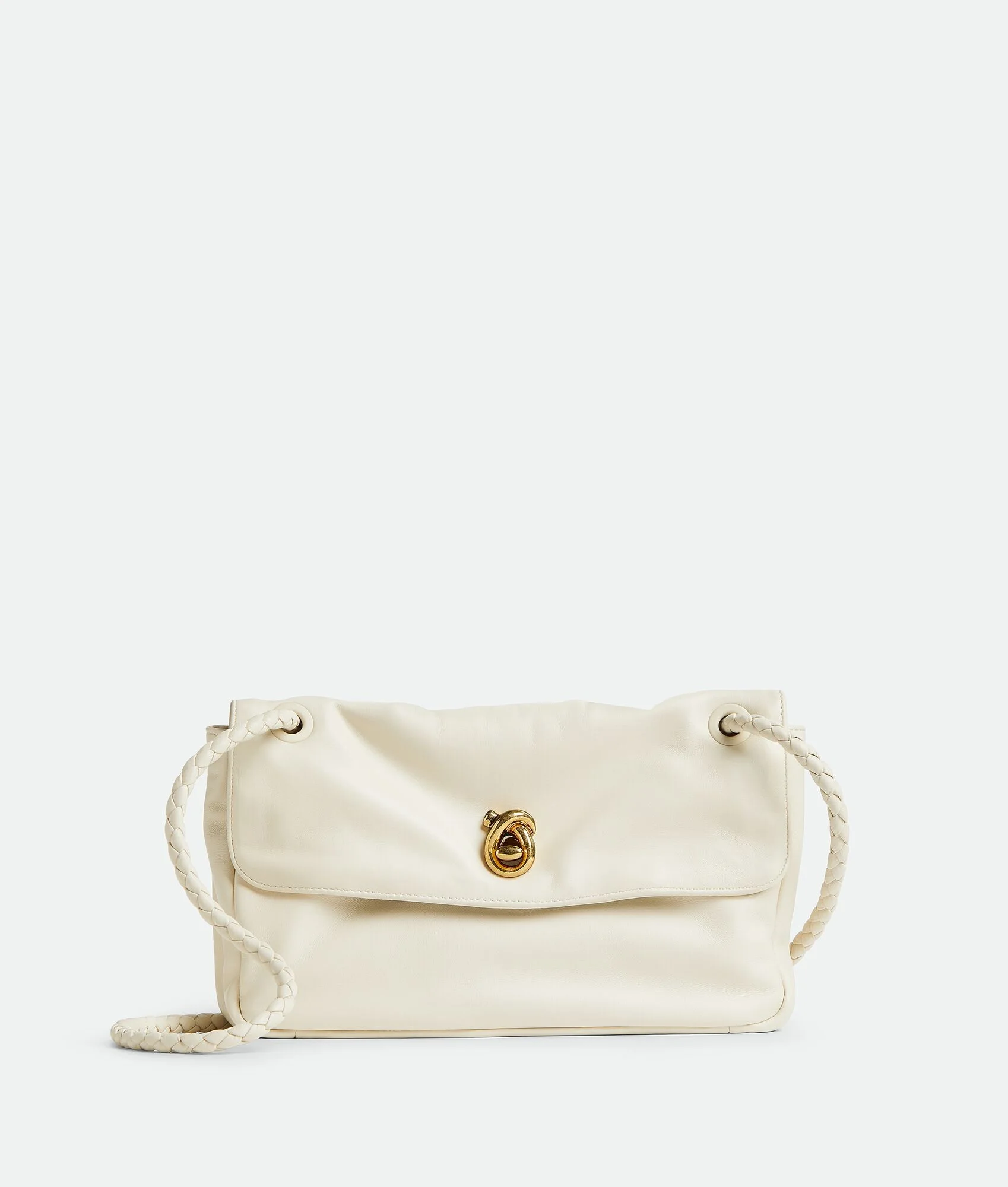 Product Details - Supple lambskin leather shoulder bag with sliding cross-body strap - The memory flap can be reshaped and adapted to hold countless forms - One main compartment - Single interior zipped pocket - Metallic knot lock closure - Lining: Lambskin - Color: Sea salt - Hardware: Brass finish - Height: 16 cm | 6.3" - Width: 27 cm | 10.6" - Depth: 6 cm | 2.4" - Strap drop: 50 cm | 19.7" - Made in: Italy - Product code: 836296V5TJ09211