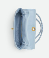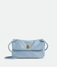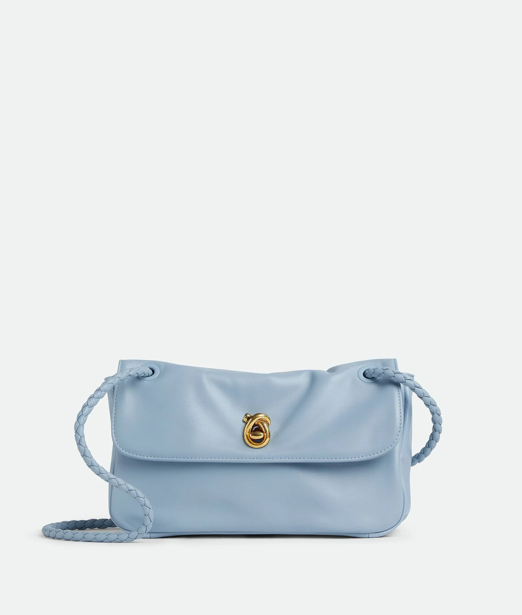 Product Details - Supple lambskin leather shoulder bag with sliding cross-body strap - The memory flap can be reshaped and adapted to hold countless forms - One main compartment - Single interior zipped pocket - Metallic knot lock closure - Lining: Lambskin - Color: Ice - Hardware: Brass finish - Height: 16 cm | 6.3" - Width: 27 cm | 10.6" - Depth: 6 cm | 2.4" - Strap drop: 50 cm | 19.7" - Made in: Italy - Product code: 836296V5TJ01718