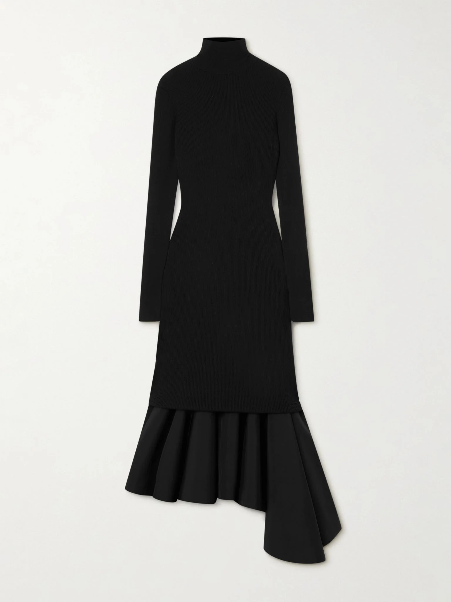 Asymmetric satin-trimmed ribbed-knit turtleneck midi dress Black