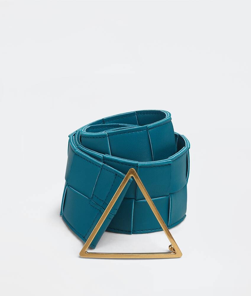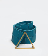 • Intreccio leather belt • Pin closure Material: 80% Lambskin 20% Brass Lining: Calf leather Color: Mallard Hardware: Gold finish Height: 6 cm Depth: 0.5 cm Made in: italy