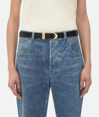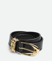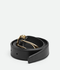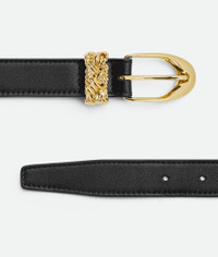 Smooth calfskin leather belt with loop buckle and Intreccio metal detail. Product Details - Prong closure - Material: calfskin - Lining: Calfskin - Color: Black - Hardware: Gold - Height: 2.5 cm | 1" - Depth: 0.5 cm | 0.2” - Made in: Italy - Product code: 805113VALKO8425
