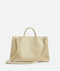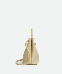 Top handle bag in silky calf leather with signature knot detail and sliding cross-body Product Details - Medium silky calfskin top handle bag with sliding cross-body strap - Intrecciato leather internal pocket - Magnetic closure - Material: calfskin - Lining: Suede - Color: Light Butterscotch - Hardware: Brass finish - Height: 25 cm | 9.8" - Width: 32 cm | 12.6" - Depth: 11 cm | 4.3" - Handle drop: 9 cm | 3.5” - Strap drop: 45 cm | 17.7” - Made in: Italy - Product code: 810214V4O929309